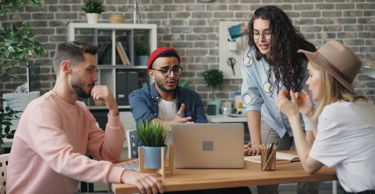 Image Description: Three colleagues talk at a desk with a laptop, notebooks, and design materials